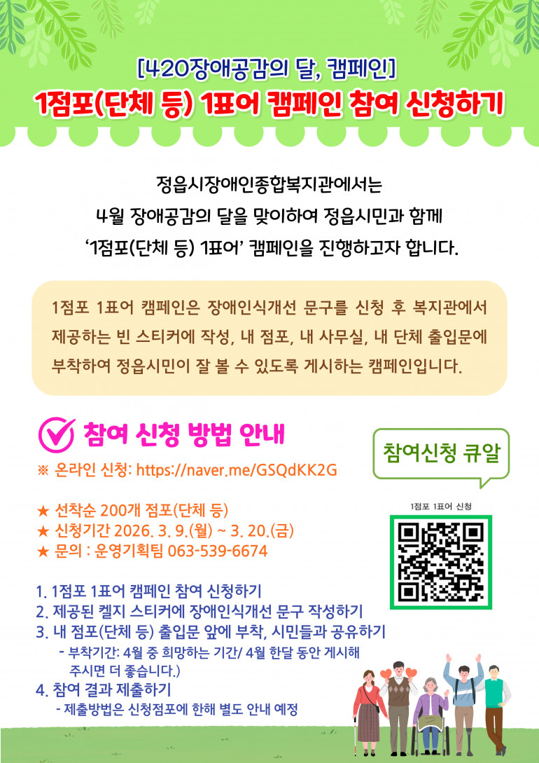 장애인복지관에서는 4월 '장애 공감의 달'을 맞이하여 정읍시민과 함께하는 '1점포(단체 등) 1표어' 캠페인을 진행하고자 합니다.