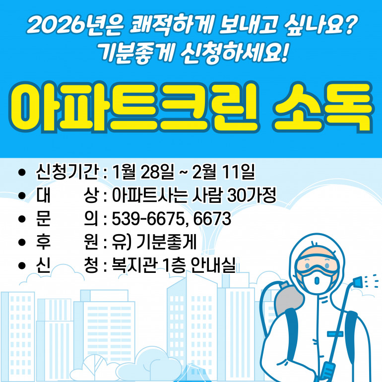 '유) 기분좋게' 업체에서 아파트에 살고계시는 장애인 30가구를 대상으로 무료 소독을 지원해드립니다. 빠르게 신청하셔서 쾌적한 생활공간을 누려보세요.^^